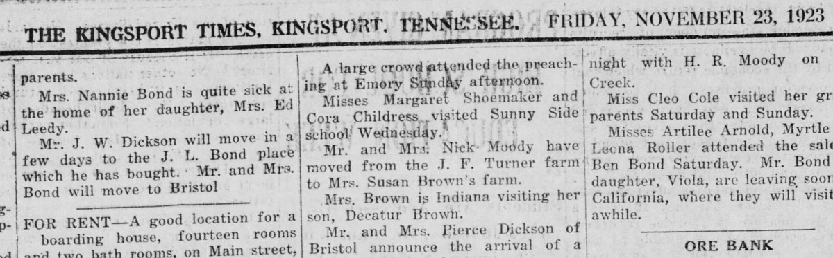 At the time of John and Carries courting, there were mainly five families that lived up and down the Orebank that headed towards the small unchartered town called Kingsport. It was a river town with creeks and swamps and a big mountain that watched over its destiny. By the time these two got together, the men of vision such as John Nolen (designer),John B. Dennis and J.Fred Johnson had already molded a town into an ingeniously designed city whose beauty and convenience of location had turned it into an important hub of industry and manufacturing and thus, jobs.